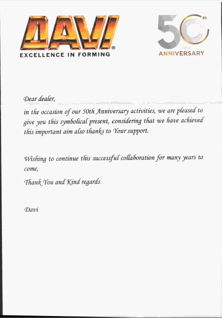 50年砥礪前行,50年春華秋實(shí)。2016年10月,將迎來(lái)Davi公司建廠50周年的喜慶日子。為了熱烈慶祝Davi建廠50周年,Davi公司特邀全球代理商和客戶前往意大利參加50周年慶典,我們蘇州哈利機(jī)械設(shè)備有限公司作為意大利Davi在國(guó)內(nèi)代理商將會(huì)榮幸受邀參加!